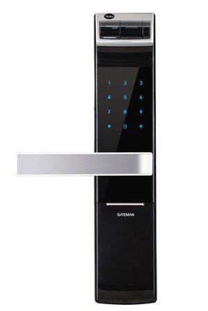 Fechadura digital residencial com acionamento via leitor digital ou senha numérica.